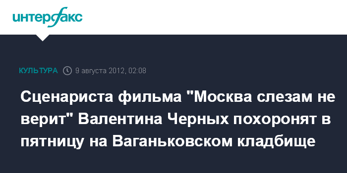 Москва. 9 августа. ИНТЕРФАКС - Кинодраматург, автор сценария к оскароносному фильму "Москва слезам не верит" Валентин Черных будет похоронен в пятницу, 10 августа, на Ваганьковском кладбище в Москве, сообщили в четверг "Интерфаксу" в Союзе кинематографистов РФ.