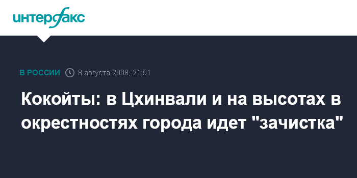 Москва. 8 августа. INTERFAX.RU - Президент Южной Осетии Эдуард Кокойты сообщил в пятницу вечером "Интерфаксу", что "в настоящее время идет зачистка Цхинвали". "Также идет работа на прилегающих к городу высотах", - отметил югоосетинский лидер.