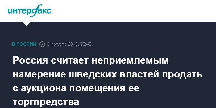 Москва. 9 августа. INTERFAX.RU - В Москве считают неприемлемыми намерения властей Швеции продать помещения, принадлежащие российскому торгпредству в королевстве.
