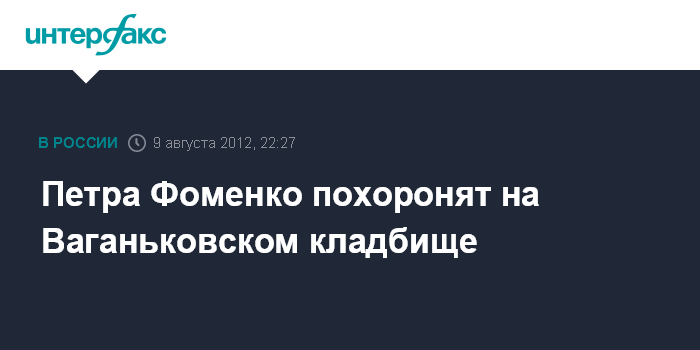 Москва. 9 августа. INTERFAX.RU - Петр Фоменко будет похоронен 13 августа на Ваганьковском кладбище, сообщили в четверг "Интерфаксу" в театре "Мастерская П.Фоменко".