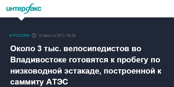 Владивосток. 10 августа. ИНТЕРФАКС–ДАЛЬНИЙ ВОСТОК – Субботнее открытие низководной эстакады, построенной во Владивостоке к саммиту АТЭС-2012, ознаменуется массовым велопробегом.