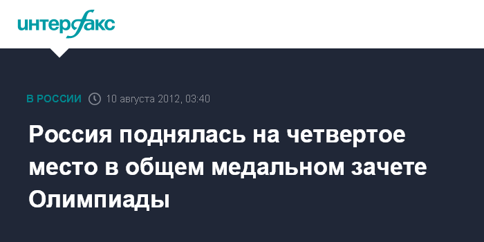 Москва. 10 августа. СПОРТ-ЭКСПРЕСС/ИНТЕРФАКС - Золотая медаль, завоеванная россиянкой Натальей Воробьевой в четверг, позволила сборной РФ подняться на четвертую строчку в общем зачете Игр в Лондоне.