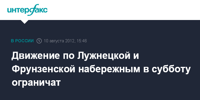Москва. 10 августа. INTERFAX.RU - Госавтоинспекция предупреждает автовладельцев об ограничении в субботу движения по Лужнецкой и Фрунзенской набережным в связи проведением марафона, приуроченного ко Дню физкультурника.