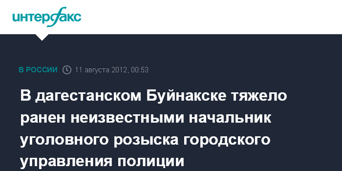 Ростов-на-Дону. 11 августа. ИНТЕРФАКС-ЮГ - Начальник уголовного розыска УВД МВД РФ по городу Буйнакску тяжело ранен неизвестными, сообщили агентству "Интерфакс - Юг" в городском УВД.