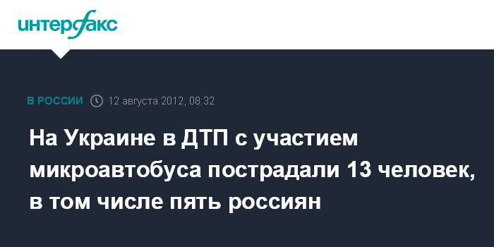 Киев. 12 августа. ИНТЕРФАКС-УКРАИНА - На Украине в результате ДТП на 18-м км автодороги Одесса-Мелитополь-Новоазовск 13 человек госпитализированы, из них пять граждан Российской Федерации, трое граждан Белоруссии и пять украинцев.