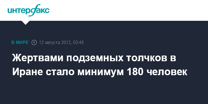 Лондон. 12 августа. INTERFAX.RU - По последним данным, в результате двух землетрясений в Иране погибло, по меньшей мере, 180 человек, около 1300 получили различные травмы, передает британская телерадиовещательная корпорация Би-би-си. Местные власти заявляют, что количество погибших может возрасти.
