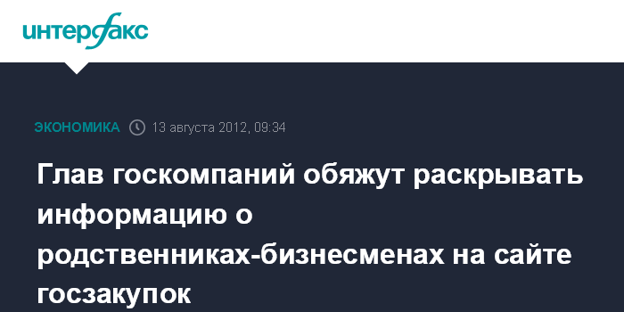 Москва. 13 августа. INTERFAX.RU - С апреля 2013 г. руководители госкомпаний будут обязаны лично сообщать операторам сайта госзакупок данные о родственниках-бизнесменах, пишут "Известия" в понедельник.