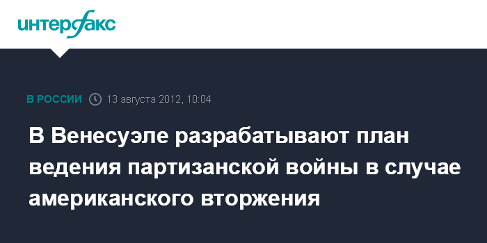 По ее словам, этот план разработан на случай вторжения войск США в Венесуэлу. Он предусматривает возможность быстрого формирования в стране хорошо подготовленных партизанских отрядов общей численностью в примерно миллион человек.