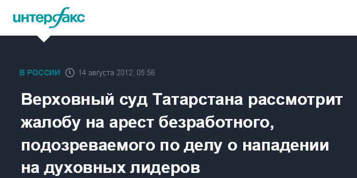 Верховный суд Татарстана рассмотрит жалобу на арест безработного, подозреваемого по делу о нападении на духовных лидеров