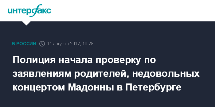 Санкт-Петербург. 14 августа. INTERFAX.RU - Полиция Петербурга приступила к проверке возможного нарушения закона о пропаганде гомосексуализма на концерте Мадонны 9 августа, сообщили "Интерфаксу" в главном управлении МВД по северной столице.