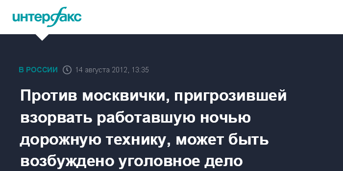 Москва. 14 августа. INTERFAX.RU - Москвичка, ребенку которой ночью мешала спать асфальтоукладочная техника, пообещала полиции ее взорвать, сообщил "Интерфаксу" источник в правоохранительных органах.