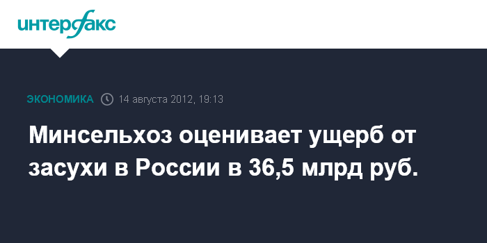 Москва. 14 августа. INTERFAX.RU - Ущерб отрасли растениеводства от засухи в России оценивается, по предварительным данным, в 36,5 млрд рублей, гибель посевов сельхозкультур, согласно оперативным данным регионов, зафиксирована в 21 субъекте РФ, общая площадь гибели посевов составляет свыше 5,56 млн га (7,3% от общей посевной площади).