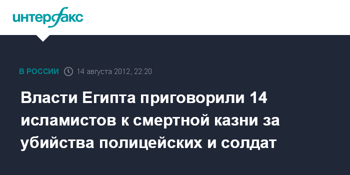 Дубай. 14 августа. INTERFAX.RU - Суд Египта приговорил к смертной казни 14 исламистов за убийства полицейских и военнослужащих, совершенные на севере Синайского полуострова в 2011 году, сообщил во вторник межарабский телеканал "Аль-Арабия".