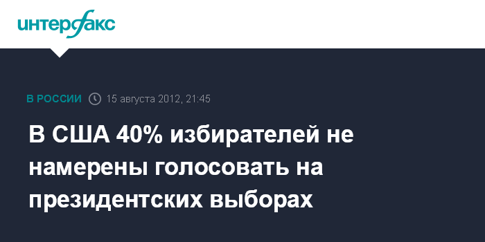 Вашингтон. 15 августа. INTERFAX.RU - Почти 40% избирателей США, в общей сложности 80 млн совершеннолетних, не собираются участвовать в выборах президента страны 6 ноября этого года, свидетельствуют результаты опроса, проведенного университетом Саффолка и опубликованного в газете USA Today.