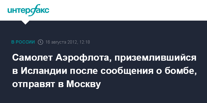 Москва. 16 августа. INTERFAX.RU - Самолет "Аэрофлота", совершивший экстренную посадку в Исландии из-за угрозы взрыва, вылетит в Москву в 23:15 по московскому времени, сообщили "Интерфаксу" в пресс-службе авиакомпании.
