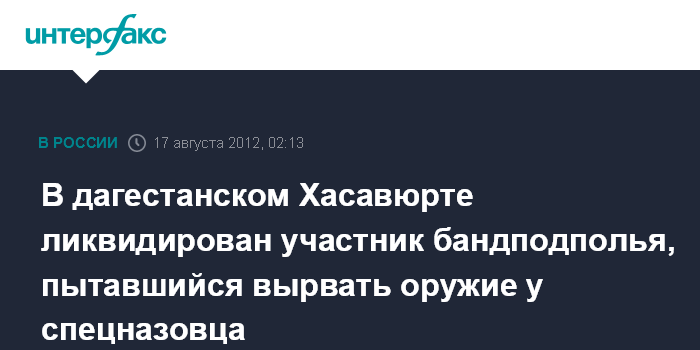 Ростов-на-Дону. 17 августа. ИНТЕРФАКС-ЮГ - Активный участник бандподполья уничтожен при задержании в городе Хасавюрте (Дагестан), сообщили агентству "Интерфакс - Юг" в городском управлении полиции.