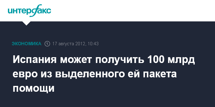 17 августа. INTERFAX.RU - Испания в экстренном порядке может получить средства из выделенного ей пакета помощи объемом 100 млрд евро, поскольку ужесточение Европейским центральным банком (ЕЦБ) условий кредитования финкомпаний вынуждает страну искать новые возможности спасения Bankia SA, сообщило агентство Bloomberg со ссылкой на источник, знакомый с ситуацией.