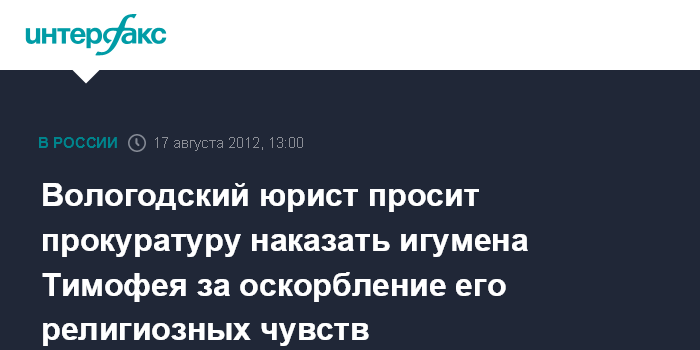 Вологда. 17 августа. INTERFAX.RU - Вологодский юрист Владимир Механиков подал заявление в прокуратуру на московского игумена Тимофея (Алексей Подобедова), в котором просит прокуратуру Вологодского района защитить его религиозные чувства и наказать священнослужителя в соответствии с законом.