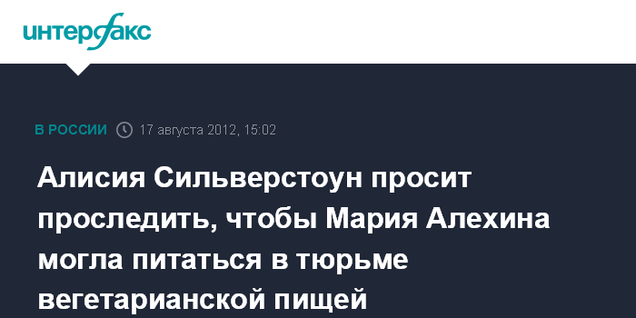 Лондон. 17 августа. INTERFAX.RU - Известная американская актриса Алисия Сильверстоун в письме российскому руководству попросила обеспечить одну из участниц панк-группы Pussy Riot вегетарианку Марию Алехину пищей растительного происхождения в тюрьме, сообщает в пятницу веб-сайт британской газеты The Guardian.
