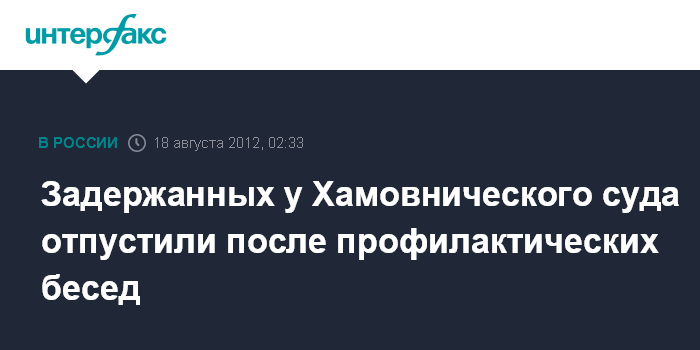 Москва. 18 августа. ИНТЕРФАКС - Задержанные в пятницу вечером у здания Хамовнического суда в Москве отпущены из отделов полиции, сообщили в ночь на субботу в пресс-службе столичного главка МВД.