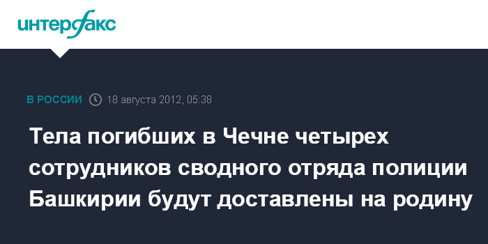 Уфа. 18 августа ИНТЕРФАКС-ПОВОЛЖЬЕ - Четыре сотрудника сводного отряда полиции МВД по Башкирии погибли в Грозненском районе Чечни при исполнении служебного задания, сообщили агентству "Интерфакс-Поволжье" в пресс-службе МВД по Республике Башкортостан.