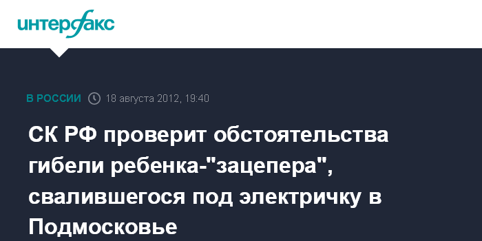 "По предварительным данным, 17 августа 2012 года примерно в 17:40 мск в 30 метрах от платформы Челюнскинская обнаружено тело мальчика. Со слов очевидца, ребенок катался на сцепке электропоезда сообщением Софрино-Москва, не удержавшись, сорвался и упал под поезд", - говорится в сообщении, размещенном в субботу на сайте в СК РФ.