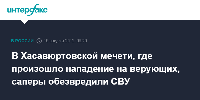 Ростов-на-Дону. 19 августа. ИНТЕРФАКС - Взрывотехники обезвредили утром в воскресенье мощное самодельное взрывное устройство, установленное в мечети Хасавюрта, где было совершено нападение на прихожан, сообщили в городском управлении полиции.