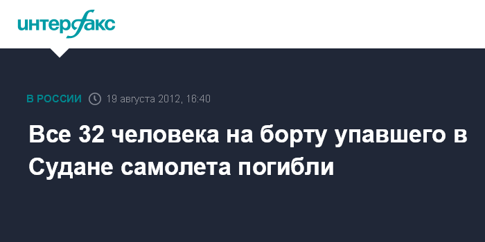 Каир. 19 августа. INTERFAX.RU - Все 32 человека, находившиеся на борту потерпевшего крушение в Судане самолета, погибли, сообщили в администрации суданского президента Омара аль-Башира в воскресенье. По данным властей, на борту самолета с правительственной делегацией, находился министр снабжения Гази аль Саддик, а также лидер партии "Мир и справедливость" Макки Балайела.