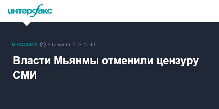 Сингапур. 20 августа. INTERFAX.RU - Власти Мьянмы (Бирмы) отменили цензуру средств массовой информации, сообщила в понедельник пресс-служба министерства информации страны.