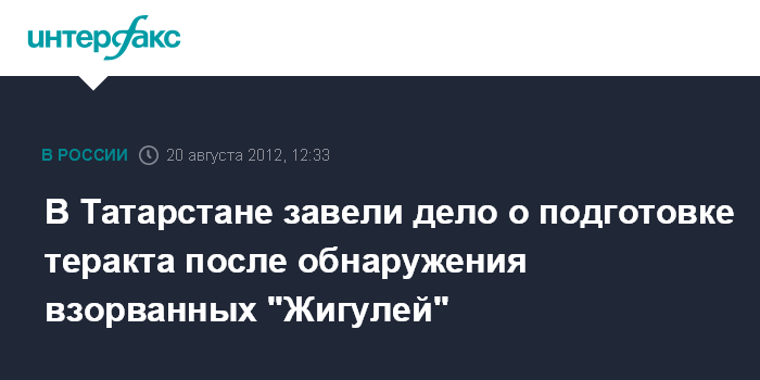 Москва. 20 августа. INTERFAX.RU - Уголовное дело о приготовлении к теракту возбуждено в Татарстане после обнаружения подорванных "Жигулей" и останков трех человек вблизи автотрассы Казань-Зеленодольск, сообщили в СК РФ.