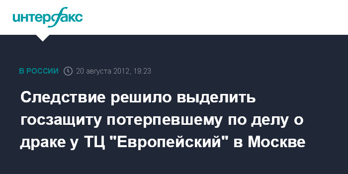 Москва. 20 августа. INTERFAX.RU - Потерпевшему по делу о массовой драке у торгового центра "Европейский" в Москве выделена государственная защита после жалоб на угрозы со стороны обвиняемого в нападении на него, сообщила в понедельник "Интерфаксу" адвокат потерпевшего Оксана Михалкина.