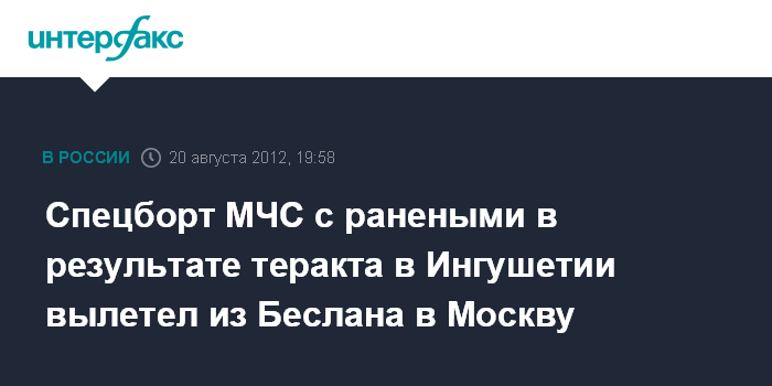 Москва. 20 августа. INTERFAX.RU - Самолет МЧС России с пострадавшими в результате теракта в Ингушетии вылетел из аэропорта Беслана.