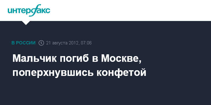 Москва. 21 августа. ИНТЕРФАКС - Четырехлетний мальчик погиб на северо-востоке Москвы, поперхнувшись конфетой, сообщил "Интерфаксу" источник в правоохранительных органах.