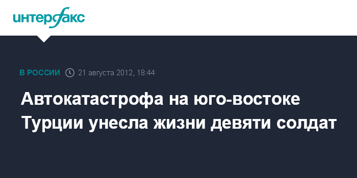 Стамбул. 21 августа. INTERFAX.RU - Жертвами автокатастрофы на юго-востоке Турции стали девять военнослужащих турецкой армии и шофер, сообщил местному телевидению губернатор провинции Мардин Вахдеттин Эзкан.