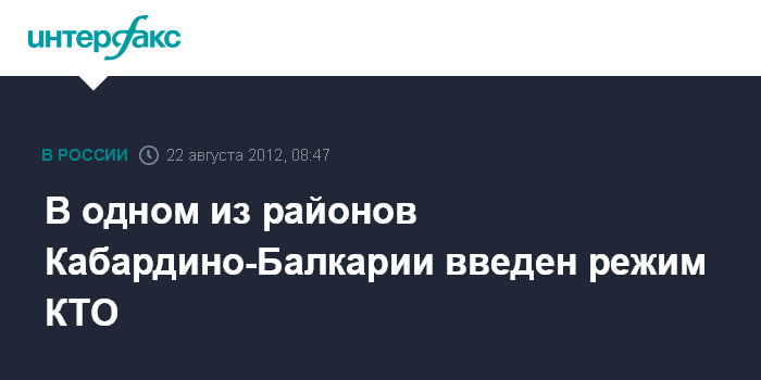 Нальчик. 22 августа. INTERFAX.RU - На части территории Баксанского района Кабардино-Балкарии с 8:00 мск введен режим КТО, сообщает в среду оперативный штаб в КБР.