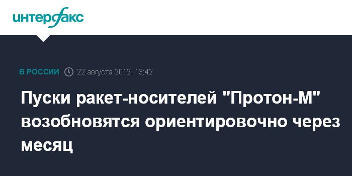 Щелково (Московская область). 22 августа. INTERFAX.RU - Ракета-носитель "Протон-М" возобновит пуски с Байконура, временно приостановленные после аварийного запуска двух спутников связи, в конце сентября - начале октября, сообщил в среду генеральный конструктор ОАО "Газпром - Космические системы" Николай Севастьянов.