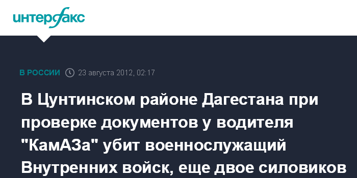 Ростов-на-Дону. 23 августа. ИНТЕРФАКС-ЮГ - Военнослужащий Внутренних войск РФ погиб в результате нападения на блок-пост неизвестных, ехавших в "КамАЗе" на территории Цунтинского района Дагестана, сообщили агентству "Интерфакс-Юг" в правоохранительных органах республики.