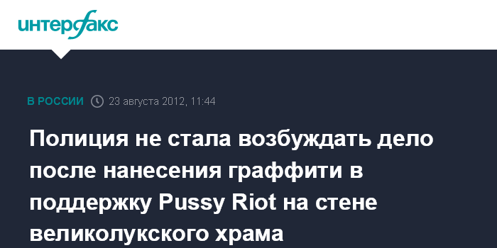 Псков. 23 августа. INTERFAX.RU - По факту нанесения граффити в поддержку группы Pussy Riot на стене Свято-Вознесенского кафедрального собора города Великие Луки уголовное дело возбуждено не будет, сообщили "Интерфаксу" в пресс-службе УМВД России по Псковской области.