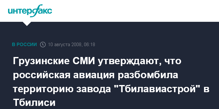 Москва. 10 августа. INTERFAX.RU - Российская авиация разбомбила территорию завода "Тбилавиастрой" в Тбилиси, сообщают в воскресенье местные СМИ. Сведений о пострадавших пока нет. "Интерфакс" не располагает информацией по этому поводу от Минобороны РФ.