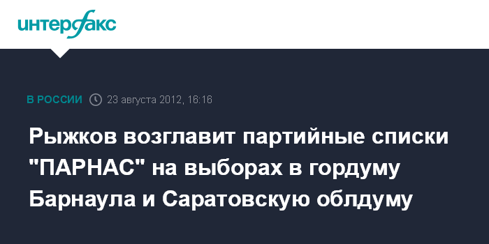 Москва. 23 августа. INTERFAX.RU - Республиканская партия России - "ПАРНАС" выдвинет своих кандидатов в Барнаульскую городскую Думу и Саратовскую областную Думу, сообщил сопредседатель этой партии Владимир Рыжков.
