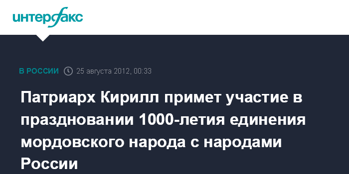Москва. 25 августа. ИНТЕРФАКС - Патриарх Московский и всея Руси Кирилл совершит в субботу первосвятительскую поездку в Мордовию в связи с празднованием 1000-летия единения мордовского народа с народами Российского государства.