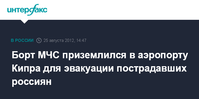 Ларнака. 25 августа. INTERFAX.RU - Спецрейс МЧС России прибыл в Республику Кипр для эвакуации россиян, пострадавших во время отдыха на Кипре. Как передает корреспондент "Интерфакса", в 14:30 мск самолет Ил-76 МЧС России совершил посадку в аэропорту Ларнаки. Планируется, что с Кипра спецрейсом в Москву будет доставлено четыре человека, в том числе 14-летняя девочка, пострадавшая в результате ДТП.