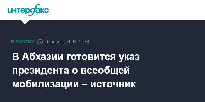 Сухуми. 10 августа. INTERFAX.RU - В течение нескольких часов в Абхазии может быть объявлена всеобщая мобилизация.