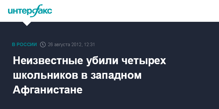 Кабул. 26 августа. INTERFAX.RU - Неизвестные вооруженные лица в воскресенье похитили группу из 10 школьников в провинции Гор на западе Афганистана, четырех из них они позже убили, сообщили в местной полиции. Инцидент произошел недалеко от столицы провинции - города Чагчаран. Местным жителям удалось схватить четырех подозреваемых в похищении людей. В настоящее время полиция занимается расследованием происшествия.