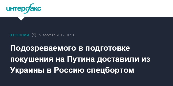 Москва. 27 августа. INTERFAX.RU - Илья Пьянзин - один из подозреваемых в подготовке покушения на президента РФ Владимира Путина - был доставлен в минувшую субботу с Украины в Москву спецсамолетом, экстрадиция прошла без эксцессов, сообщил "Интерфаксу" источник в российских спецслужбах.