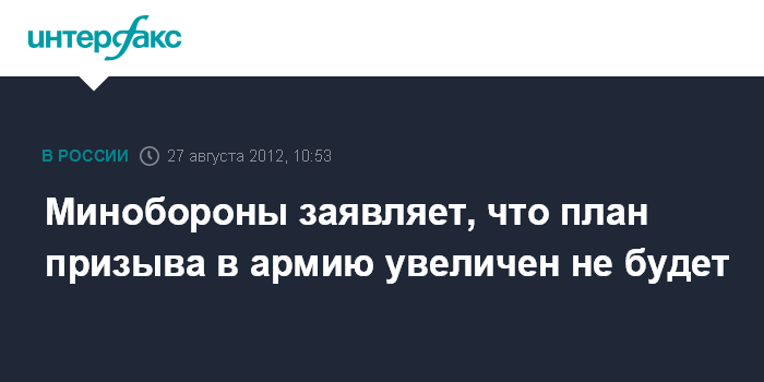 Москва. 27 августа. INTERFAX.RU - Министерство обороны России не планирует увеличивать на 50 тыс. человек численность осеннего призыва 2012 года.