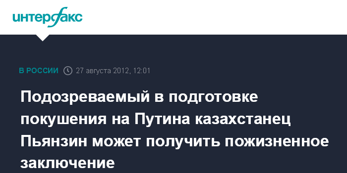 Москва. 27 августа. INTERFAX.RU - Гражданину Казахстана Илье Пьянзину, подозреваемому в подготовке покушения на президента РФ Владимира Путина, в России при признании его вины грозит от 20 лет тюрьмы до пожизненного заключения, сообщил источник в правоохранительных органах.