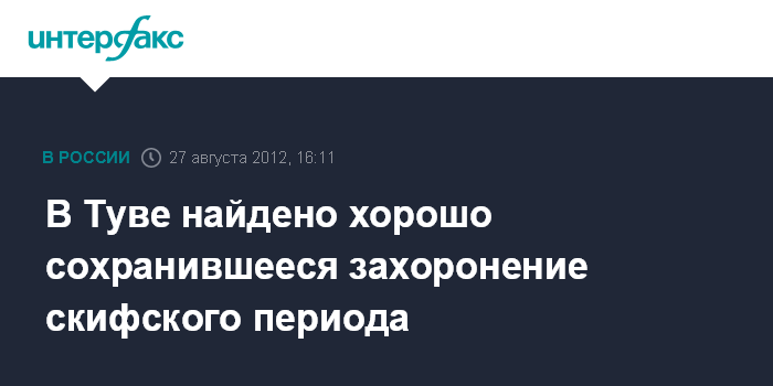 Москва. 27 августа. INTERFAX.RU - Члены археолого-географической экспедиции Русского географического общества "Кызыл-Курагино" сделали уникальную находку: в кургане N1 на могильнике "Эки-Оттуг 1" раскопано хорошо сохранившееся погребение в срубе.