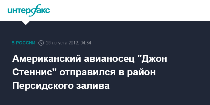Вашингтон. 28 августа. ИНТЕРФАКС - Американский атомный авианосец "Джон Стеннис" (John Stennis) в понедельник (во вторник утром по московскому времени) вышел с военно-морской базы "Китсэп" в Бремертоне (штат Вашингтон) в направлении района Персидского залива, сообщили местные СМИ.
