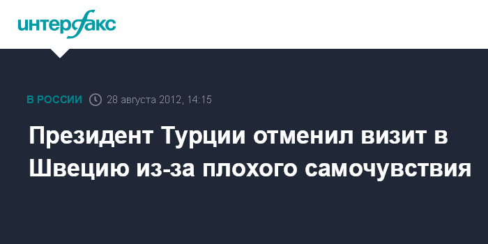 Стокгольм. 28 августа. INTERFAX.RU - Президент Турции Абдулла Гюль отменил визит в Швецию в связи с ухудшившимся состоянием здоровья, сообщила пресс-служба шведского МИД во вторник.